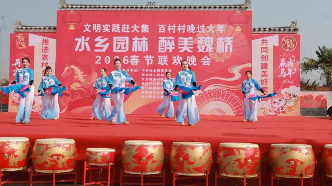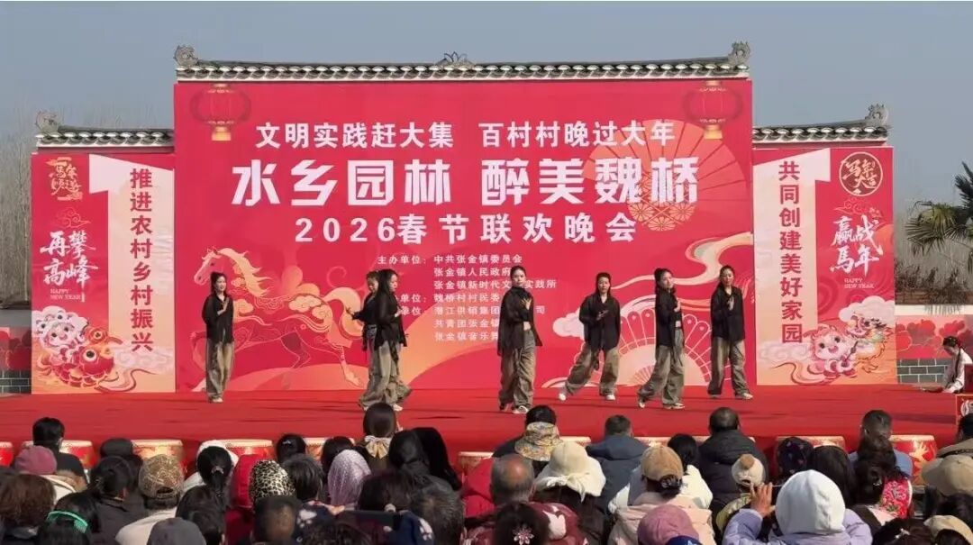 锣鼓喧天辞旧岁,欢歌笑语迎新春。2月2日,张金镇魏桥村“乡村大舞台”前人头攒动、暖意融融,“水乡园林 醉美魏桥”2026年春节联欢晚会在此热闹启幕。这场由村民自编自导自演的文化盛宴,既为乡亲们送上新春祝福,也全方位展现了魏桥村“最美乡村”建设成果与新时代农民的幸福风貌。