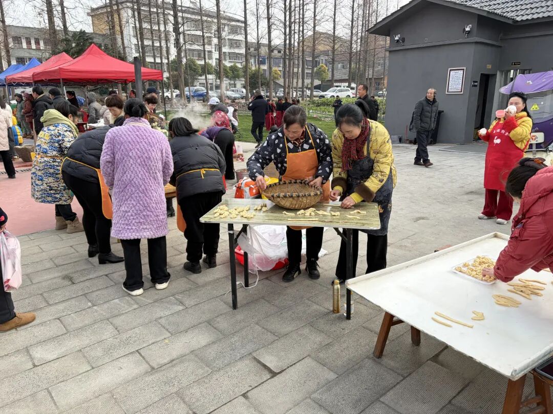 集市张灯结彩、热闹非凡,多个特色展区亮点纷呈。年货赶大集专区里,豆饼、印粑粑等龙湾非遗小吃飘香,小龙虾、黄酒等本地农特产品,以及本地企业优质好物齐聚,实现一站式年货采购;书画闹春区,镇诗词楹联学会会员现场挥毫,免费为乡亲写春联、送福字;非遗展示区,纸折花瓶、剪纸等老手艺作品精巧别致,让传统技艺焕新彩。同时,现场还设置企业招工宣传区、惠民政策宣传区,为乡亲提供家门口的就业咨询,普及“四季有虾”养殖技术、反诈、消防等实用知识,逛集之余收获满满。