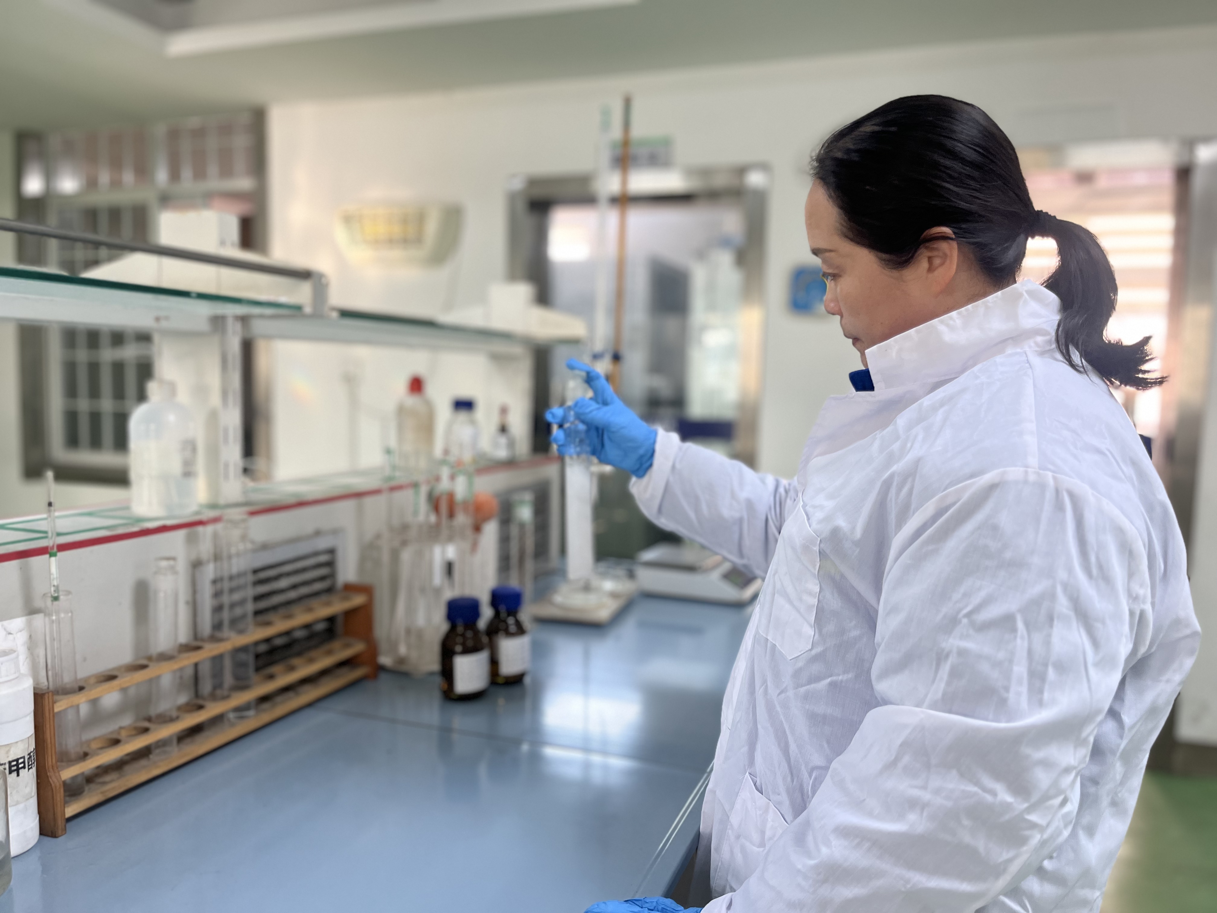 在潜江新亿宏有机化工有限公司的实验室,研发人员身着白大褂,凝神专注地开展配方调试、产品检测等工作。