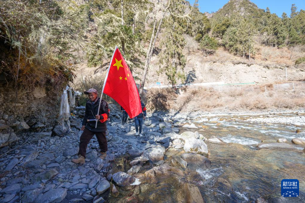 在西藏山南市隆子县玉麦乡境内,护边员普布罗布扛着国旗行走在雪坡上(2月6日摄)。