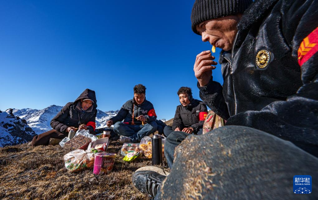 2月6日,在西藏山南市隆子县玉麦乡境内,护边员们在巡逻途中吃午饭。他们围坐在一片平坦草地,从背包里掏出糌粑、卡塞(一种传统油炸面食),再喝几口酥油茶,这就是巡逻护边途中一顿简单的午餐。