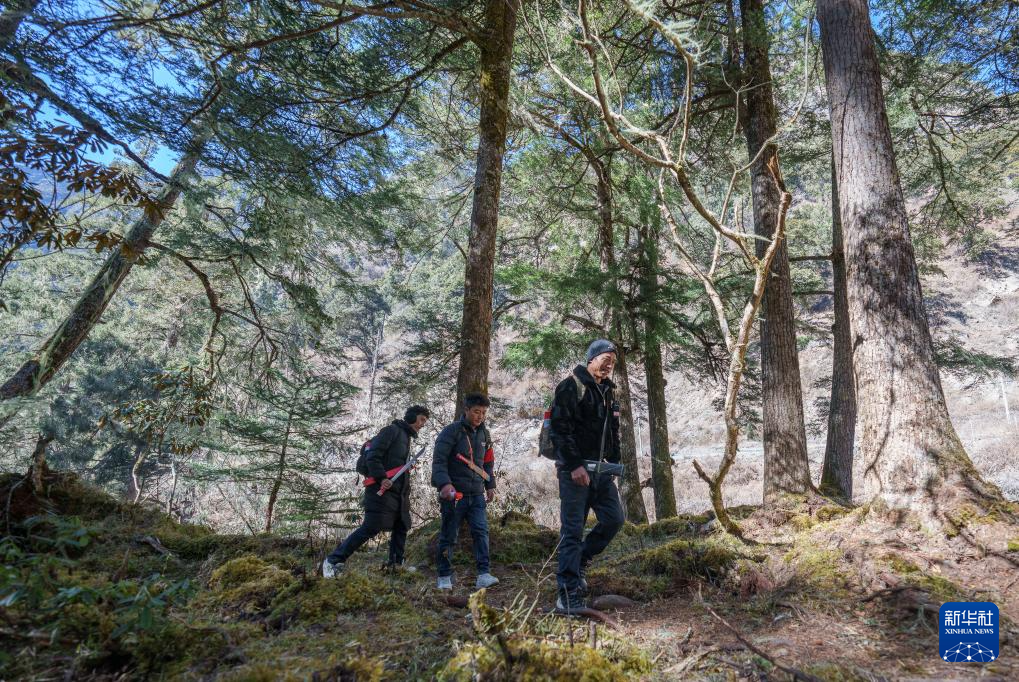 在西藏山南市隆子县玉麦乡境内,护边员们在丛林里巡逻(2月6日摄)。午饭过后,护边员们从雪线一路往下继续巡逻,海拔越来越低,树林也越来越密。茂密的藤蔓灌木有时会把人完全遮住。护边员们抽出腰间砍刀,一刀刀劈开拦路枝杈,踏出一条小径。