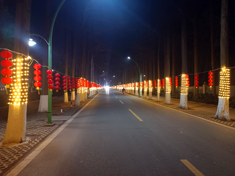 漫步街道主干道,高大挺拔的水杉整齐排列,一串串象征团圆红火的大红灯笼悬挂两侧,暖黄色灯带如流金般缠绕枝头。广场转盘、重要节点等处,街道增设主题灯饰、烟花造型灯组及文明新春景观小品,璀璨灯光与别致造型融入整洁街景,既提升了辖区“颜值”,也成为居民驻足观赏、拍照打卡的热门打卡点。