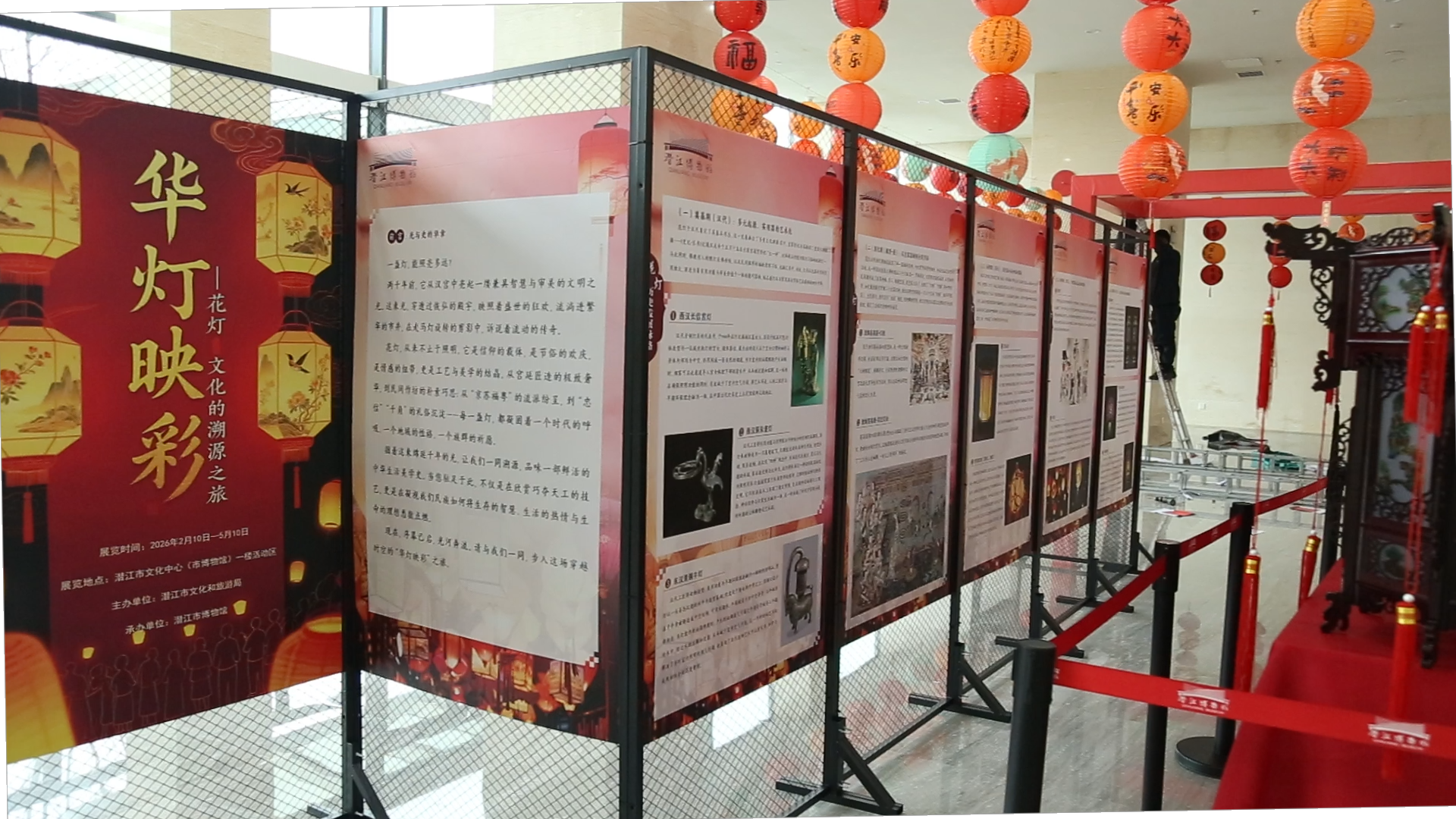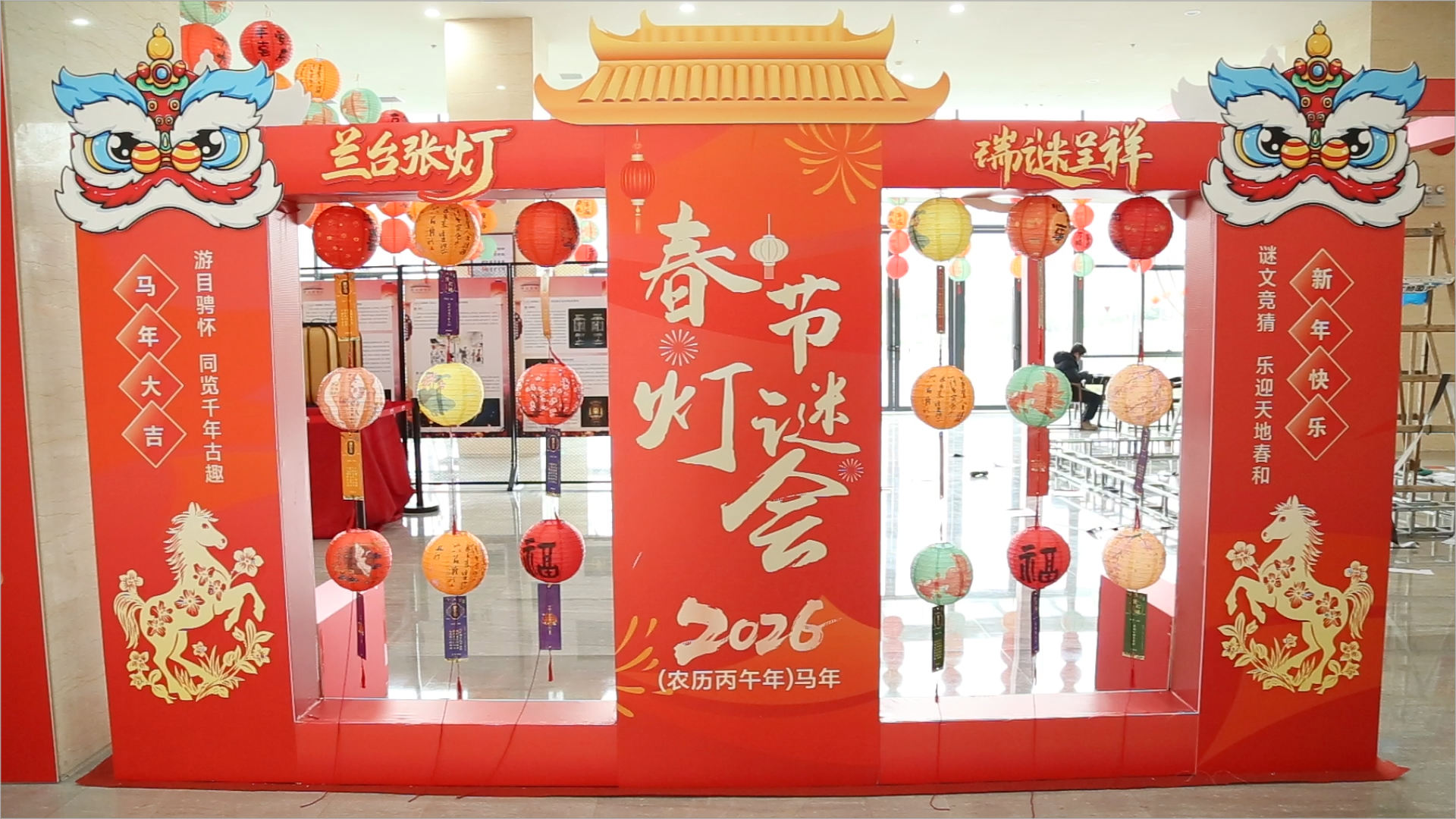 走进市博物馆,两条巨大的红色条幅映入眼帘,红绿相间的六块展板上“马年大吉”“恭贺新禧”格外吸睛,拱门上瑞兽与金马相映成趣,近百个红色灯笼尽显喜庆。