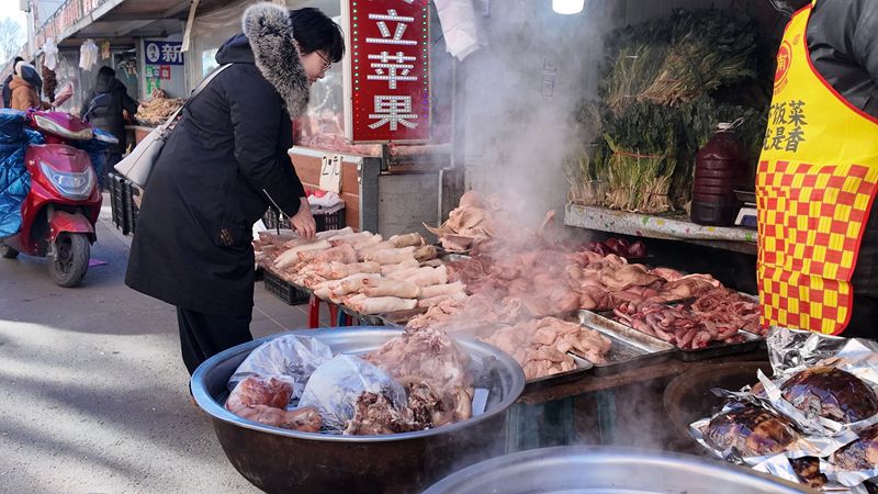 摊主们吆喝着,顾客们挑选着,人声鼎沸中流淌着最真实的生活温度。成片的牛羊肉挂在铁钩上,整鸡整鸭码放如山;刚出锅的杀猪菜、雪白的奶豆腐、深褐色的风干牛肉、赤峰特产“对夹”散发着浓郁香气,那是任何超市货架都无法复制的、粗粝而生动的“当地味道”。王姨挤在人群里,这里摸摸,那里问问价格,不时发出惊叹:“这可比新西兰的羊排看着带劲!”