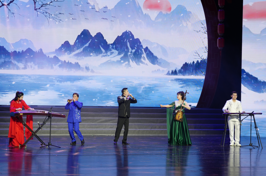 晚会在开场歌舞《春满潜江》中拉开帷幕。原创相声《虾闹大楚》以趣味穿越剧情,让潜江龙虾“走进”楚国章华宫,与芈月上演了一场美食与文化的爆笑碰撞。歌曲《打开儿时的门》旋律深情,唱出游子对家乡的绵绵眷恋;乐器合奏《九州同》丝竹齐鸣,雅韵悠扬,传递出国泰民安的美好祝愿。