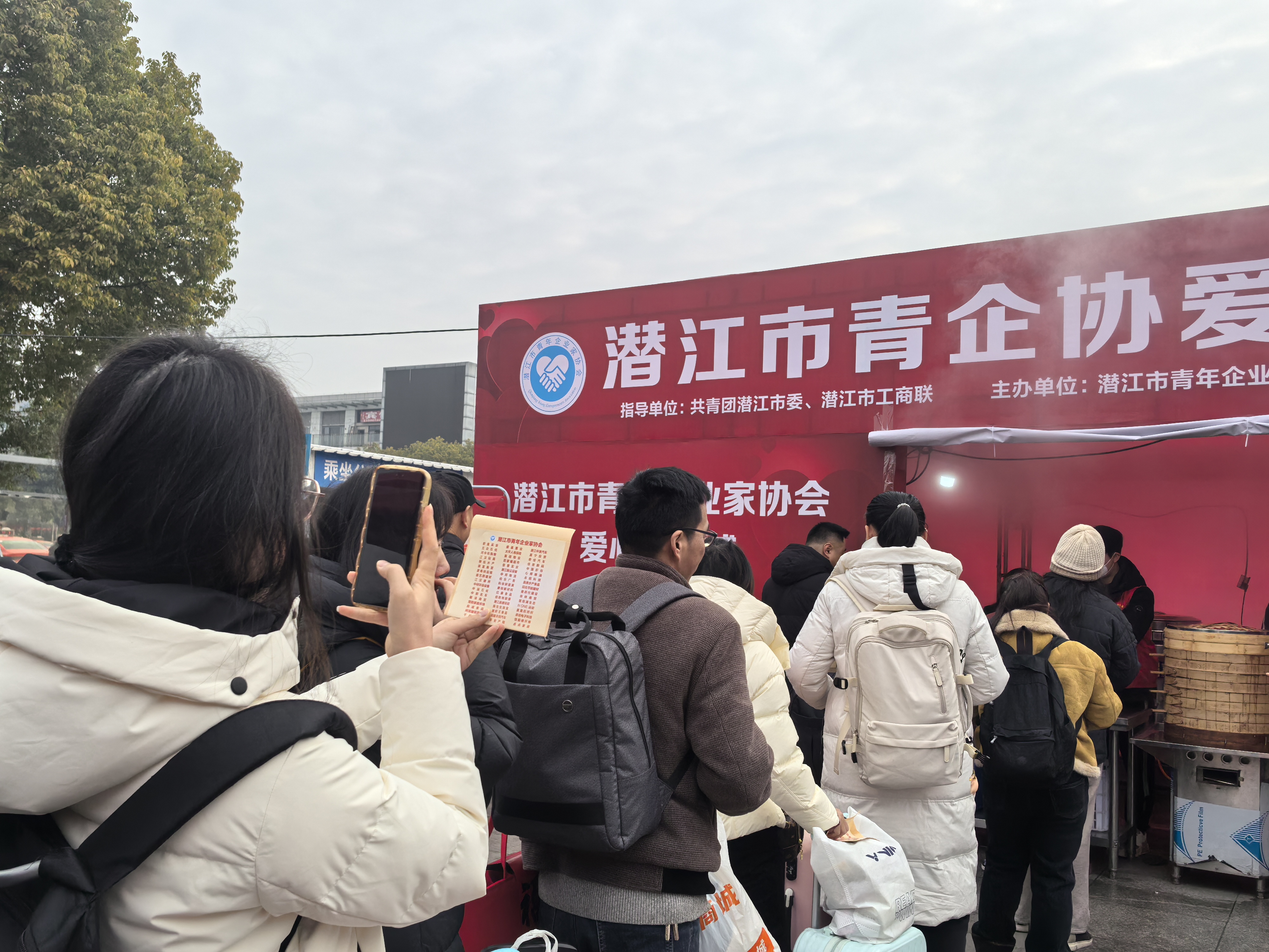 2月11日清晨,潜江火车站出站口,早班车旅客鱼贯而出。高一学生张祥虎瑞在出站口的“爱心包子铺”里给旅客打着豆浆,热气腾腾地升起——“趁热喝,小心烫!”