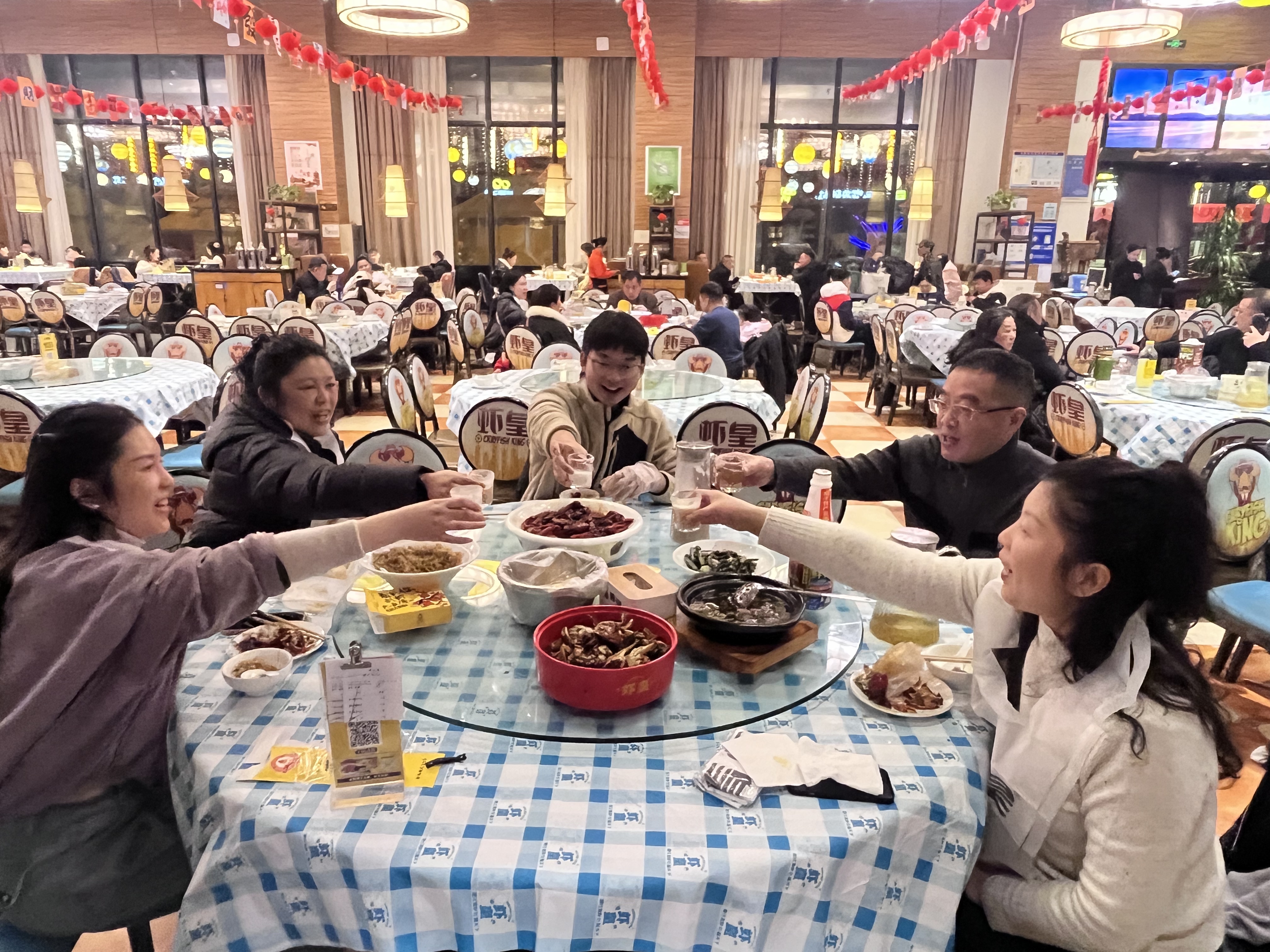 稳定充足的虾源,让餐饮企业在团年宴市场上底气倍增。“今年我们团年宴主打龙虾菜品,除夕当天已预订近150桌小龙虾团年宴,仅小龙虾就备货1000多斤,同比往年客流量得到大幅提升。”虾皇旗舰店店长董兴华介绍。店内专门推出潜江龙虾专属菜单,油焖大虾寓意“红红火火”,“全虾宴”寓意“团团圆圆”,每一道冬虾菜品都赋予吉祥年味,成为市民团年聚餐的首选。
