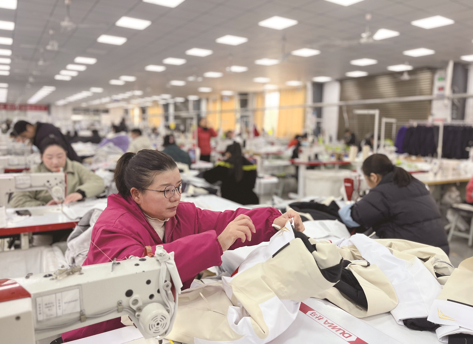 近日,位于张金镇的湖北联奥户外用品有限公司生产车间内,机器高效运转,工人们忙着赶制订单。该公司专注于高端户外服饰生产,主打采用三层压胶工艺的冲锋衣、滑雪服、羽绒服等梭织产品,产品远销北美及北欧多国。今年该公司订单已排期至8月,同时二期项目即将投产,预计新增10条生产线,进一步扩产增效。(潜江市融媒体中心记者 余晓勤 摄)