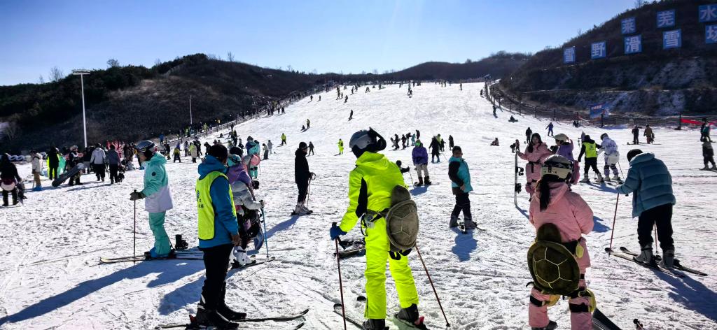 在济南市莱芜区的雪野滑雪场,游客正在滑雪