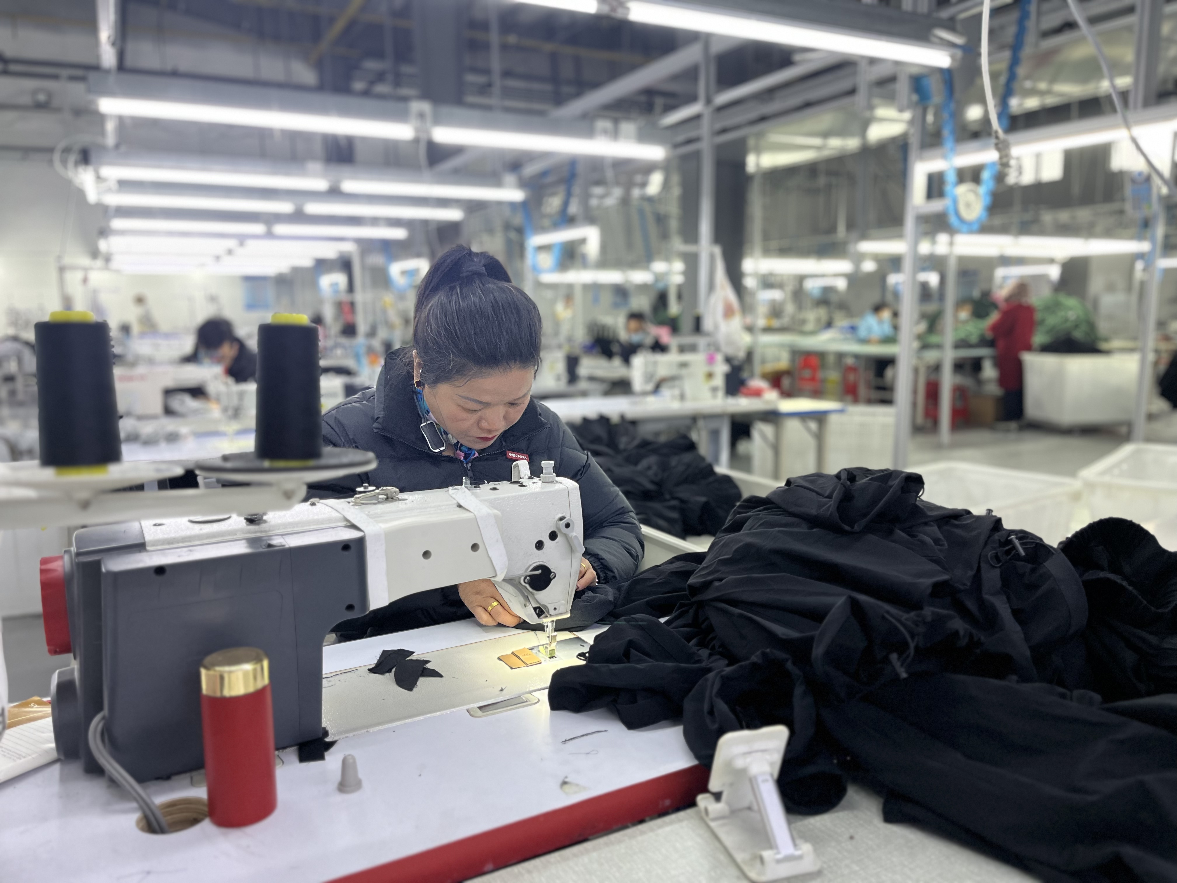 走进纹莱服饰(湖北)有限公司的现代化车间里,缝纫机“哒哒”作响,此起彼伏,工人们正熟练操作设备,裁剪、缝纫、整理,各道工序衔接有序,一条条现代化的流水线高速运转。