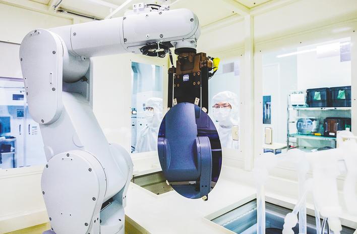 晶芯半导体(黄石)有限公司无尘车间内,机械臂高效运转。 (湖北日报全媒记者 薛婷 摄)