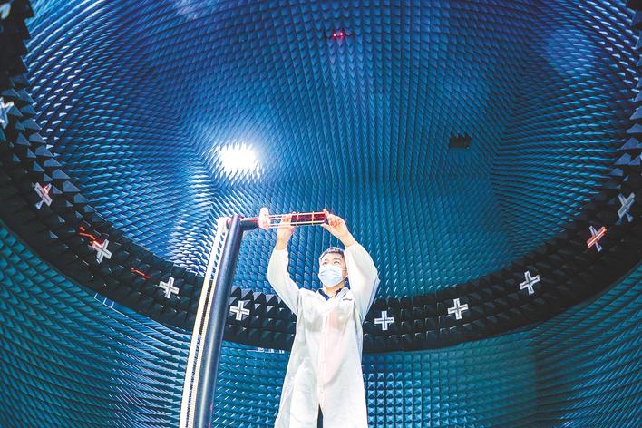 位于光谷的联想武汉产业基地内,研发人员在进行手机天线射频信号测试。(湖北日报全媒记者 魏铼 摄)