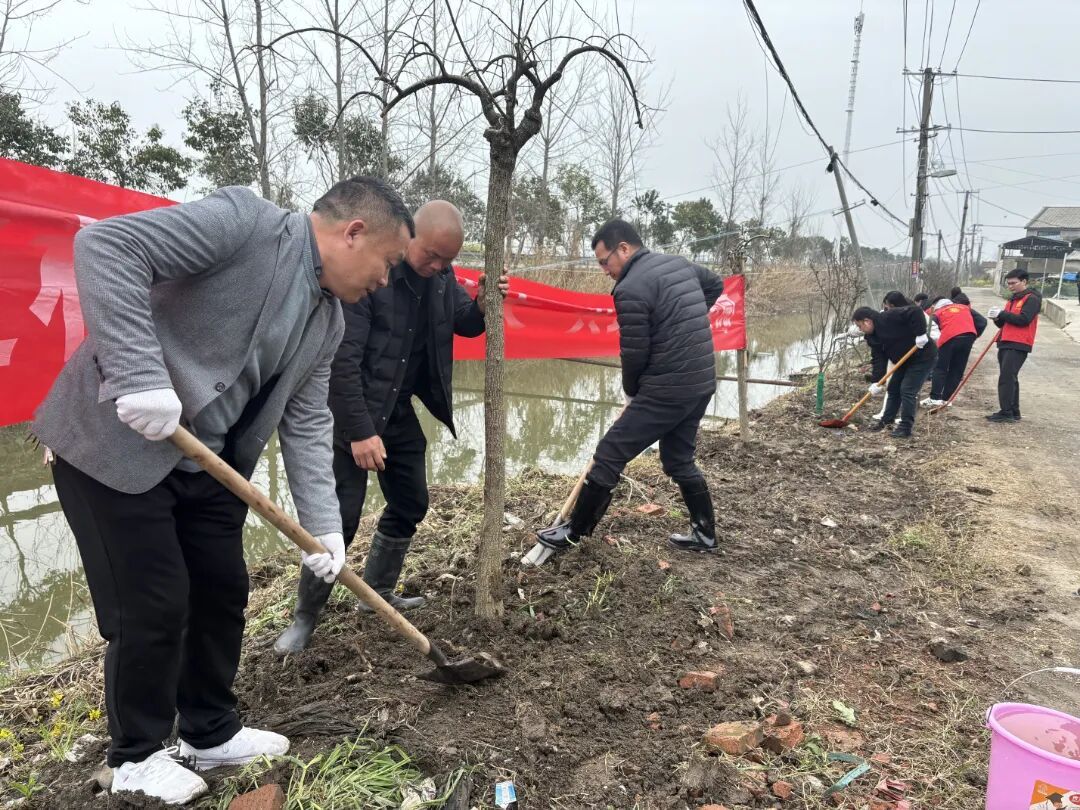 活动现场,干部职工精神抖擞、分工协作。在技术人员指导下,大家严格按照池杉树栽植标准,挥锹挖坑、扶苗正干、培土压实、浇水保墒,有条不紊地完成每道工序。池杉树耐水湿、适应性强,兼具生态与观赏价值,适配关户村滨水区位特点。经过一番劳作,一排排新苗迎风挺立,为天宝河畔勾勒出整齐的绿色风景线。