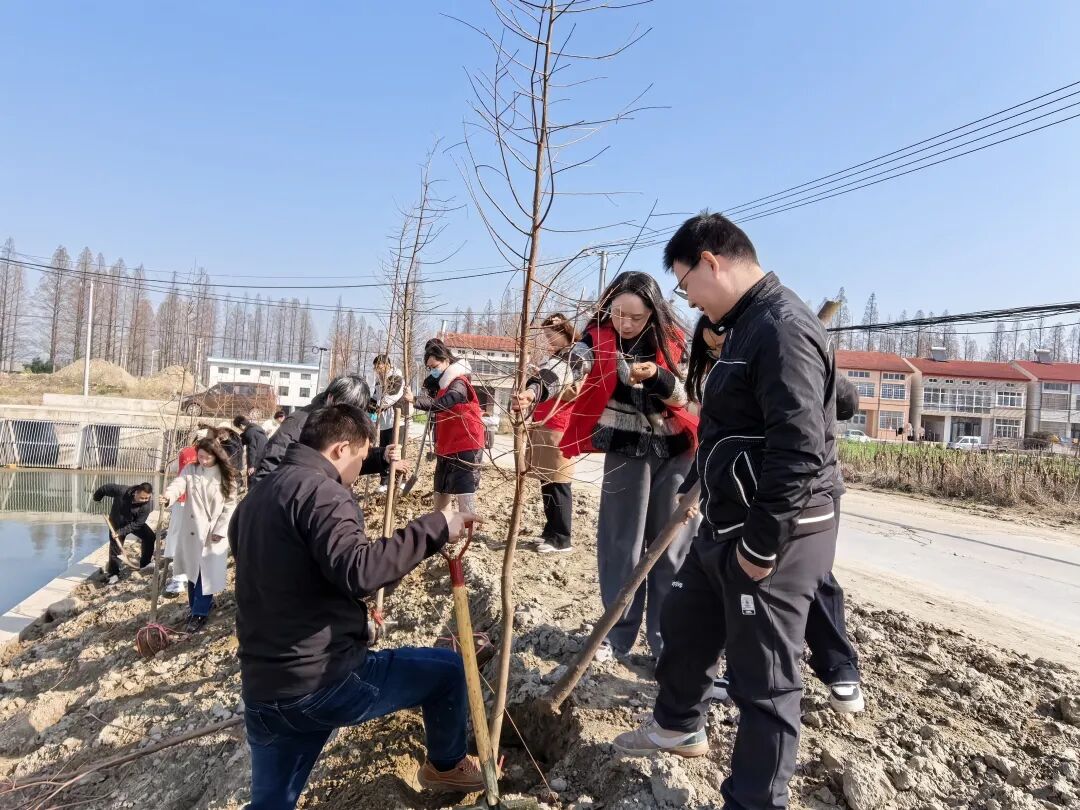 活动现场春意盎然、热潮涌动。大家分工明确、协作无间,挥锹铲土、扶苗填坑、踩实浇水,每一道工序都一丝不苟、规范到位。干部职工们热情饱满、干劲十足,三五成群、默契配合,在春日田野间躬身劳作。原本空旷的土地上,一株株树苗被稳稳栽种,黄褐色的枝干挺立向阳,错落有致地勾勒出蓬勃的生命轮廓,尽显春日劳动的鲜活气息。