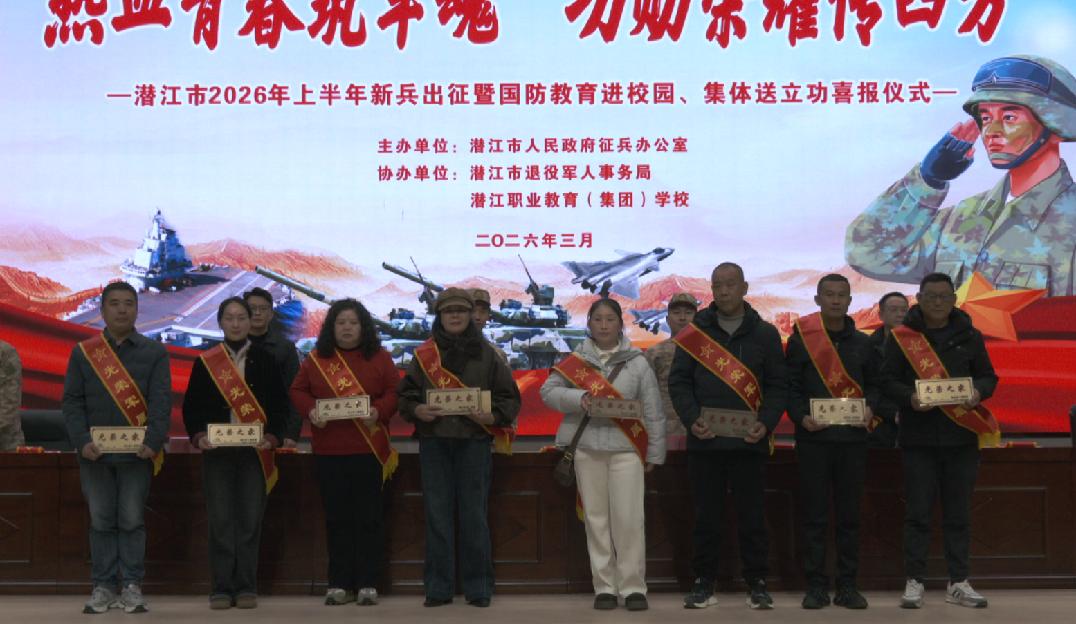 旌旗猎猎映丹心,强军战歌砺青春。3月17日,潜江职业教育(集团)学校学术交流中心内气氛庄重而热烈。由市人民政府征兵办公室主办,市退役军人事务局、潜江职业教育(集团)学校协办的2026年上半年新兵出征暨国防教育进校园、集体送立功喜报仪式在此举行。