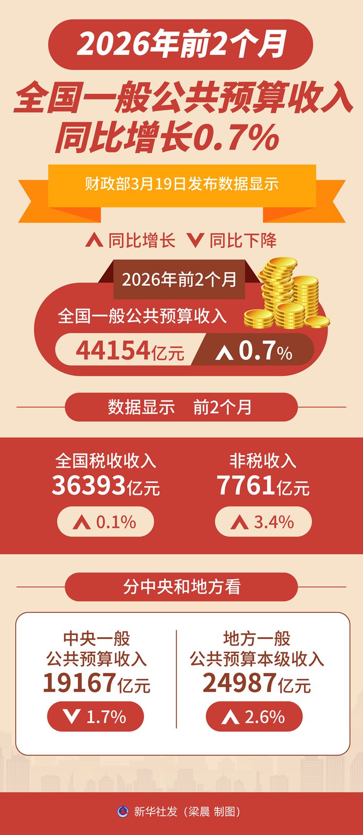 新华社北京3月19日电(记者申铖)财政部3月19日发布数据显示,今年前2个月,全国一般公共预算收入44154亿元,同比增长0.7%。