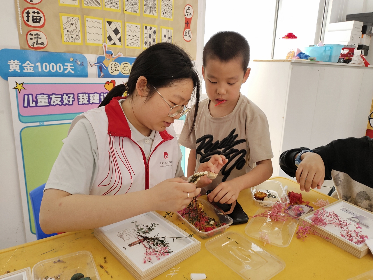 3月15日上午9时,该服务站美术课正常开展,孩子们在志愿者指导下制作手工花艺,这是服务站日常常规活动的缩影。