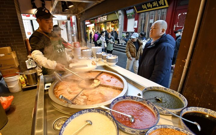 2026年2月18日,游客在北京烟袋斜街品尝美食。新华社记者 李欣 摄