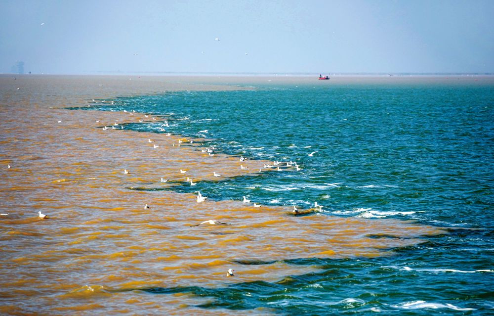 在山东东营黄河入海口,黄河水与海水形成鲜明颜色对比的独特景观(2024年10月11日摄)。新华每日电讯记者徐速绘摄