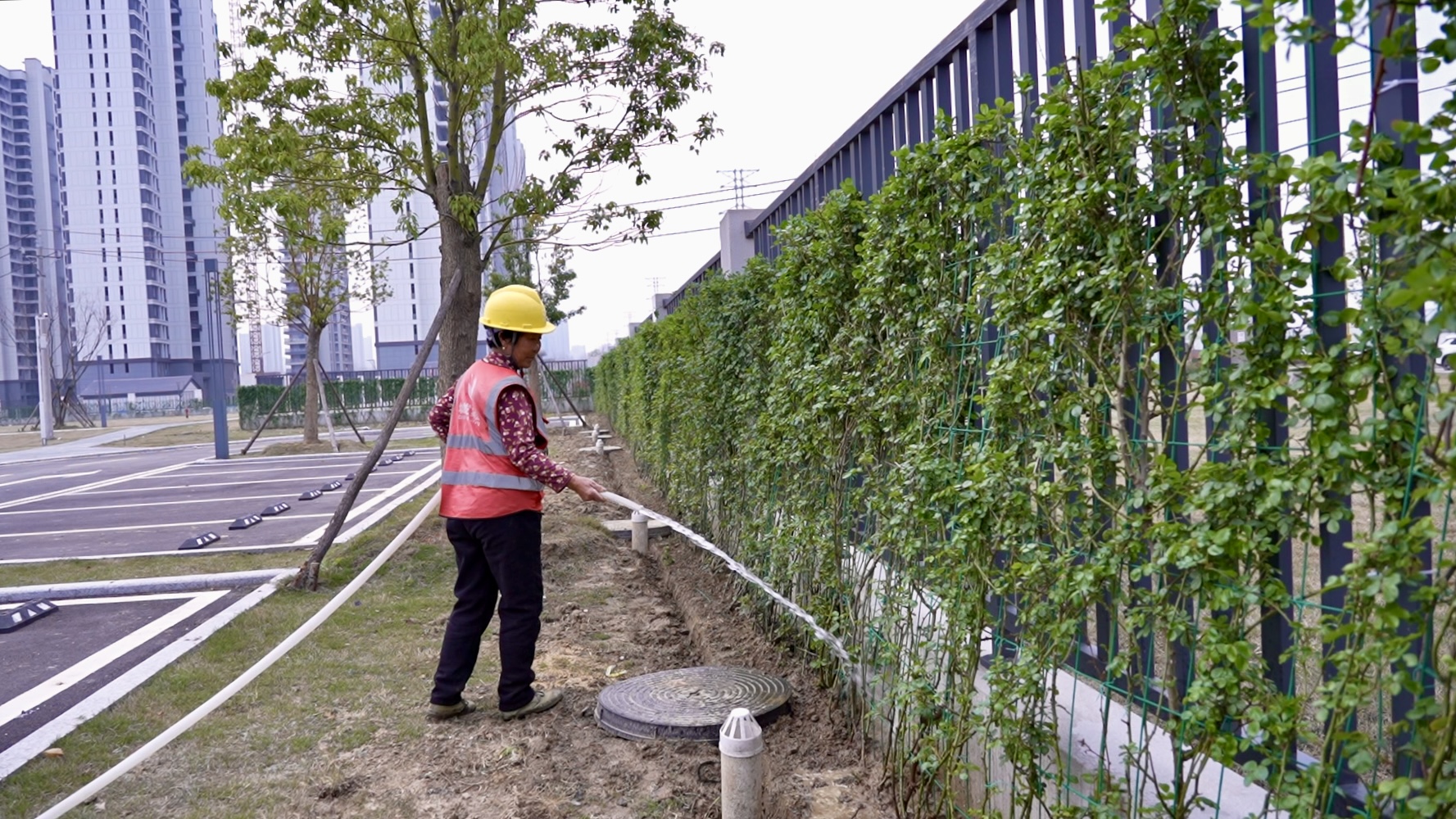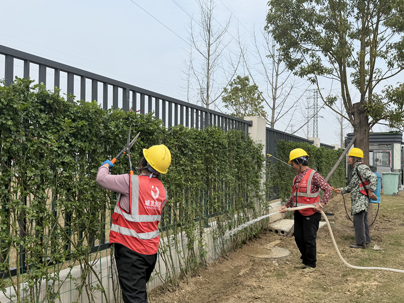 兴盛路东段数字经济产业园内,另一片绿意正悄然蔓延。3月中旬栽种的爬藤月季已抽出嫩绿枝芽,沿着栅栏向上攀爬。工人们分工协作,浇水、施药、修剪枯枝败叶,全力护航植株生长。“现在是月季生长关键期,我们会根据天气调整养护方案,预计5月上旬就能看到繁花满栅栏的美景。”市城市运营集团鸿兴物业有限公司工程负责人张守平说。