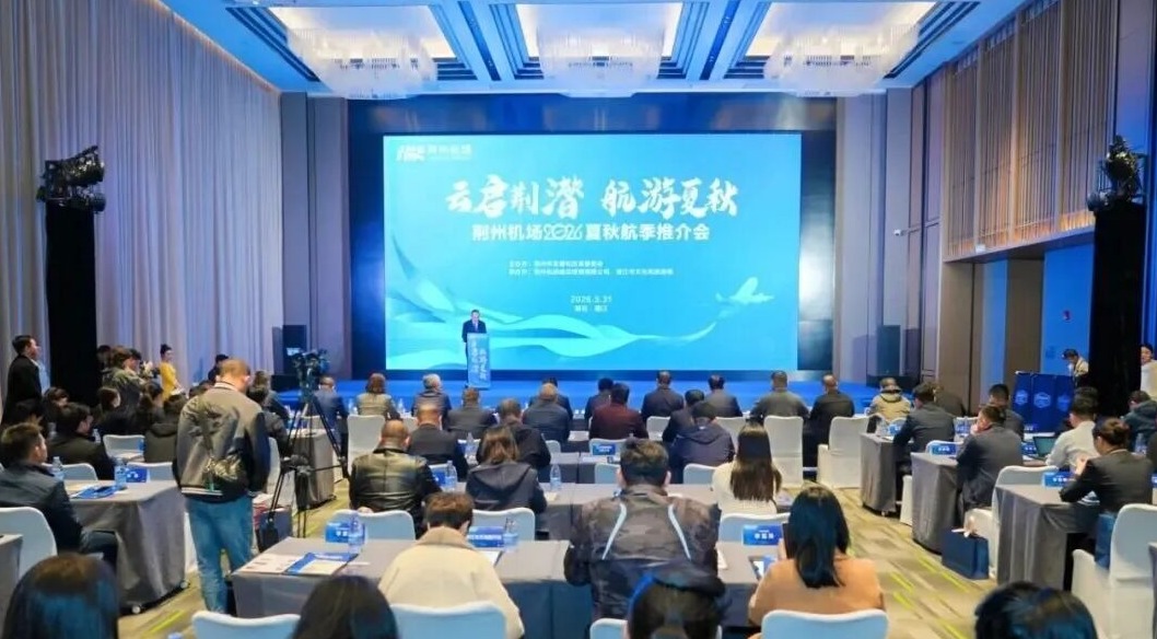 3月31日上午,“云启荆潜 航游夏秋”2026年荆州·潜江航空旅游推介会在潜江希尔顿欢朋酒店隆重举行。来自荆州、潜江两地的政府部门、航空企业、文旅机构及媒体代表齐聚一堂,共话航旅融合新路径,共谋区域协同新图景。