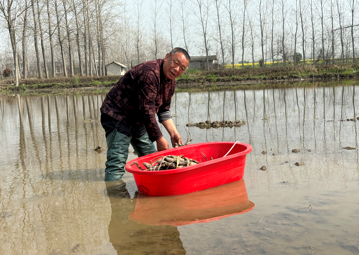 3月28日,在杨市街道刘市村,63岁的农户黄天宝正在自家的10亩水田里栽种1000多株香莲36号。该品种3月播种、5月开花、7月即可采收,亩产400至500斤莲子,行情好时每亩可获利4000至5000元。(潜江市融媒体中心记者 王富田 摄)