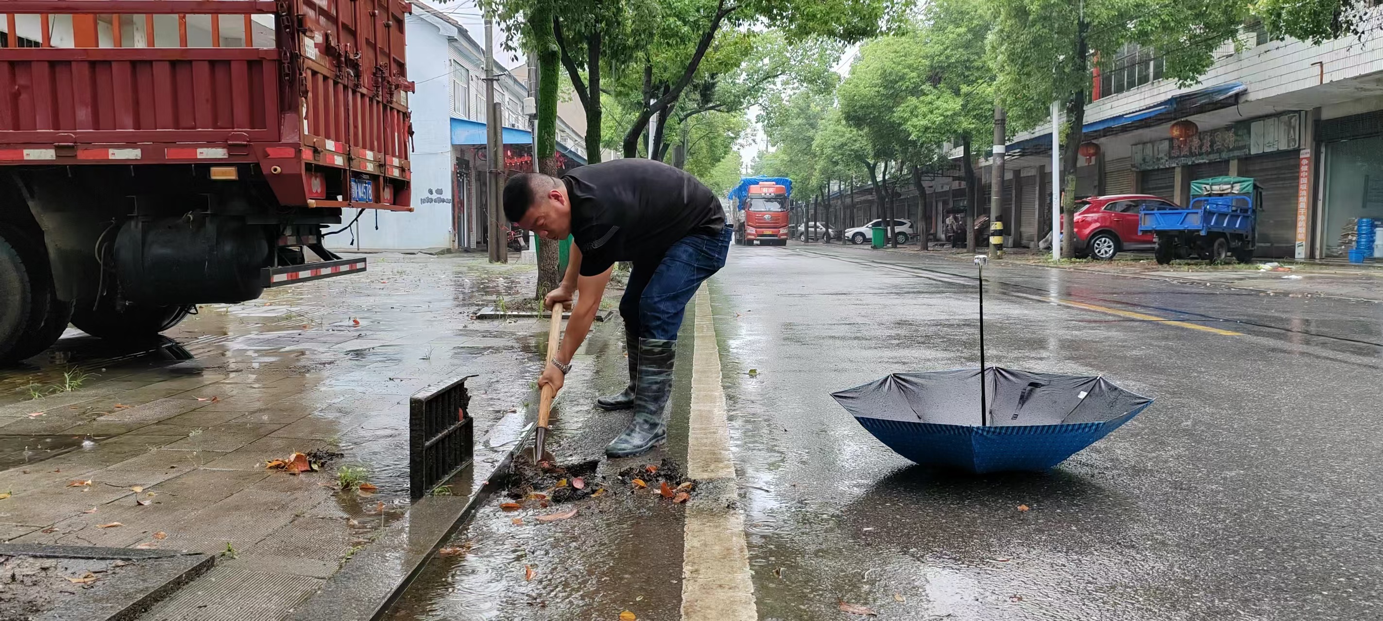 在各积水路段,抢险人员冒雨作业,及时打开雨水口与检查井,清理井口周边落叶、垃圾等杂物,保障排水管网畅通,加快渍水排泄速度。同时,通过定点值守、分段巡查、循环处置的方式,对重点区域积水情况进行动态管控。