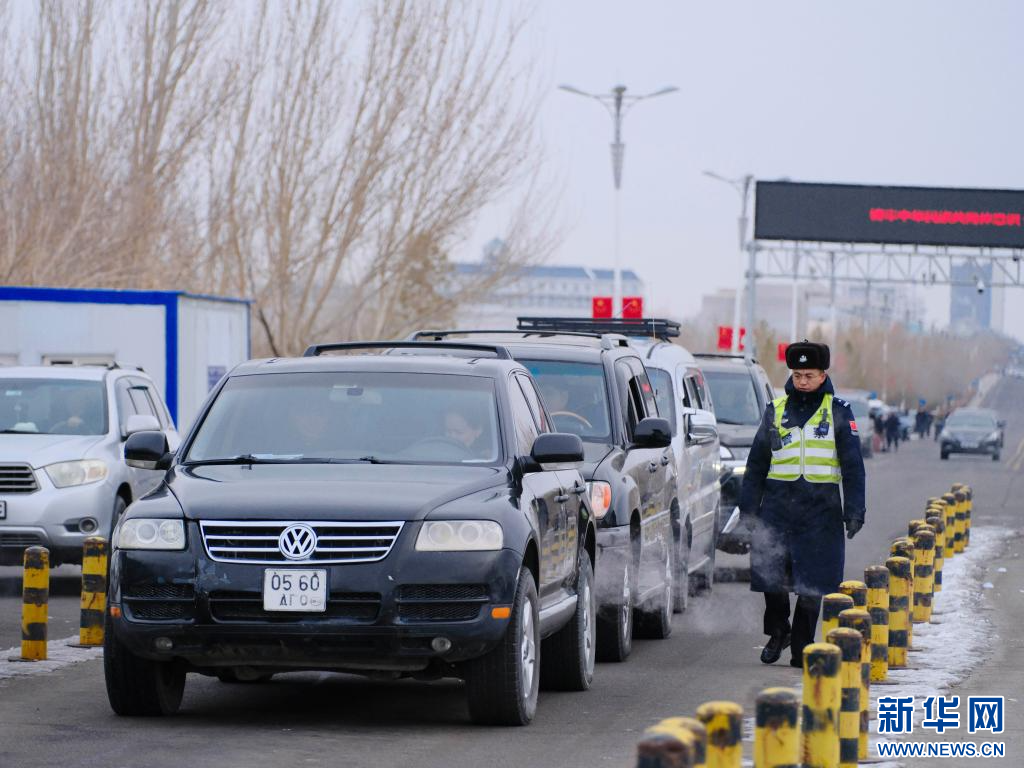 2025年12月23日,出入境货车排队通过满洲里公路口岸。 新华社记者 马金瑞 摄