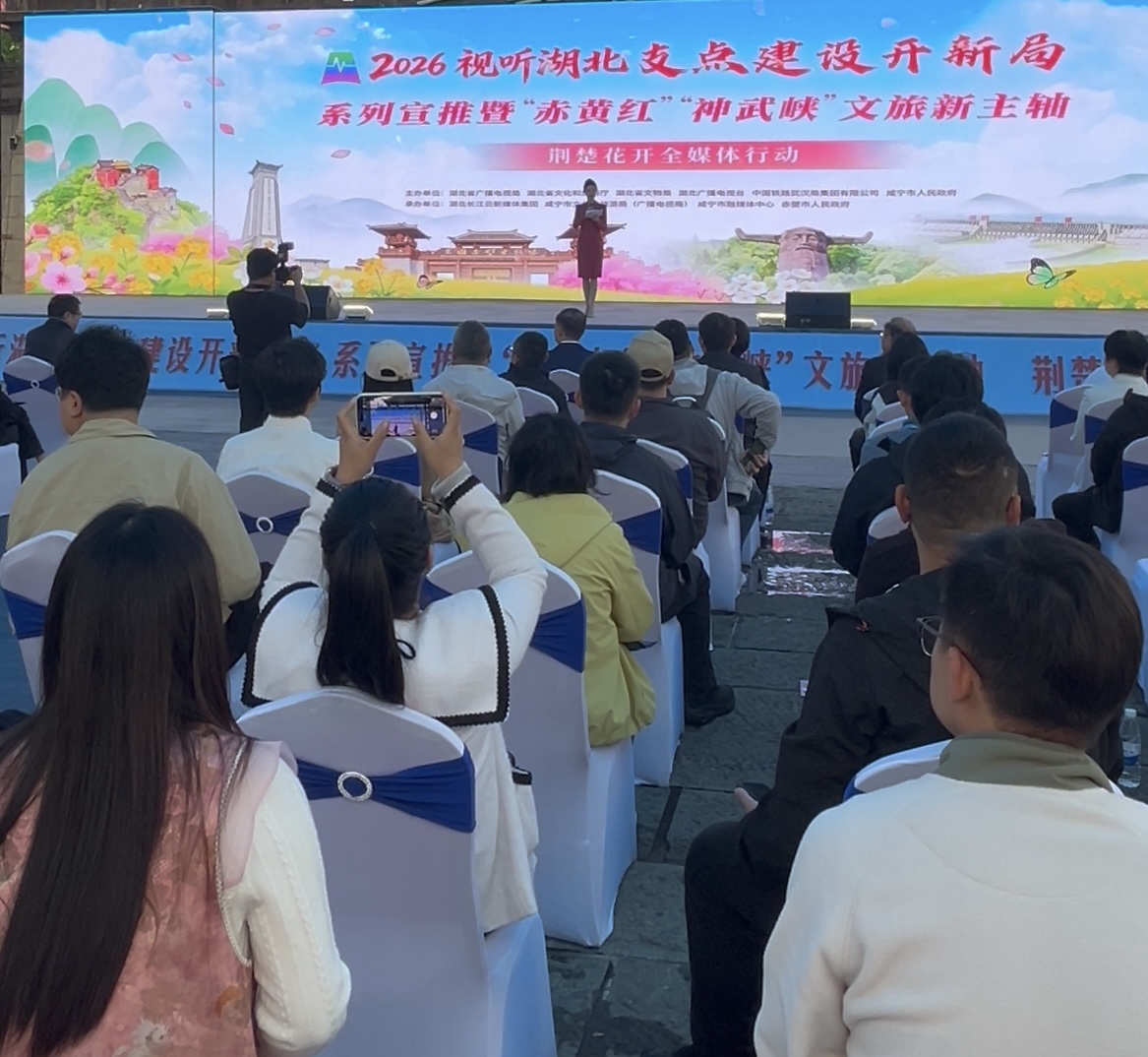 4月9日,2026视听湖北“支点建设开新局”系列宣推暨“赤黄红”“神武峡”文旅新主轴·荆楚花开全媒体行动在咸宁赤壁三国古战场盛大启幕。本次活动由湖北省广播电视局、省文化和旅游厅、省文物局、湖北广播电视台、中国铁路武汉局集团有限公司、咸宁市人民政府联合主办,来自全省各级广电部门、社交媒体平台及媒体记者代表近200人齐聚长江之滨,共同见证这一文旅与媒体融合发展的盛事。