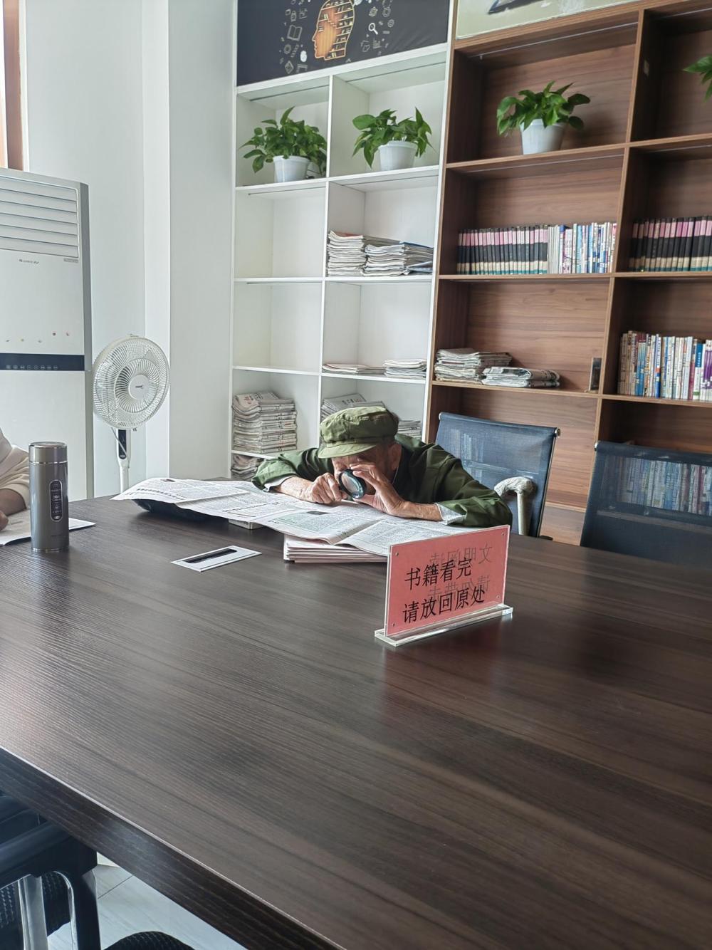 拿起今天刚到的一摞报纸,姜云鹤安静地坐在靠窗的位置,手里握着一把放大镜,凑近报纸逐字逐句细读,神情专注而安详。老人听力稍弱,口齿也有些含糊,交流并不顺畅。但从攀谈中可以知道,他住在信江新区社区养老服务中心,就在城市书房旁边,每天在这里度过的时间,能有五六个小时。读书看报,是他晚年最惬意的消遣。
