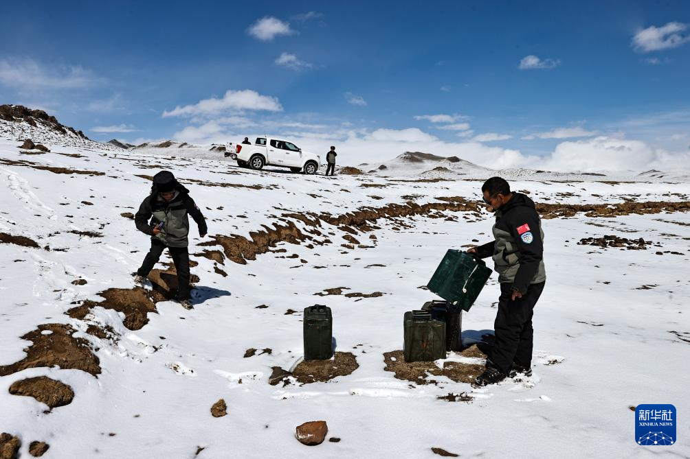 4月10日,羌塘国家级自然保护区那曲地区管理局野生动物专业管护员罗布(右)和格桑加措在“巴毛穷宗”地区查看非法穿越者遗弃的油桶。
