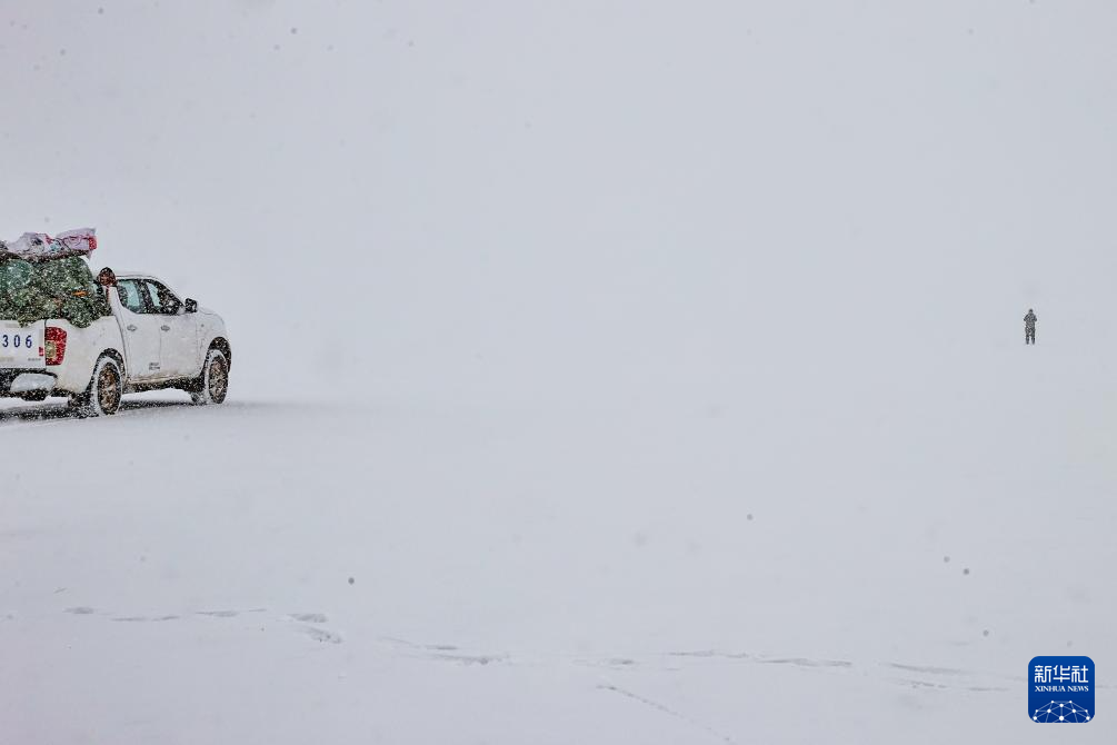 4月9日,在巡护途中遇到暴雪,羌塘国家级自然保护区那曲地区管理局野生动物专业管护员格桑伦珠徒步为车队勘察安全线路。