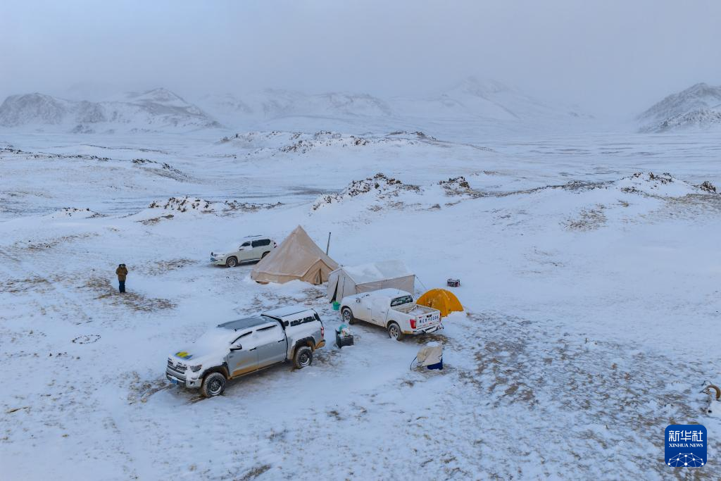 4月11日,羌塘国家级自然保护区那曲地区管理局的巡护队伍在“巴毛穷宗”地区雪中宿营(无人机照片)。