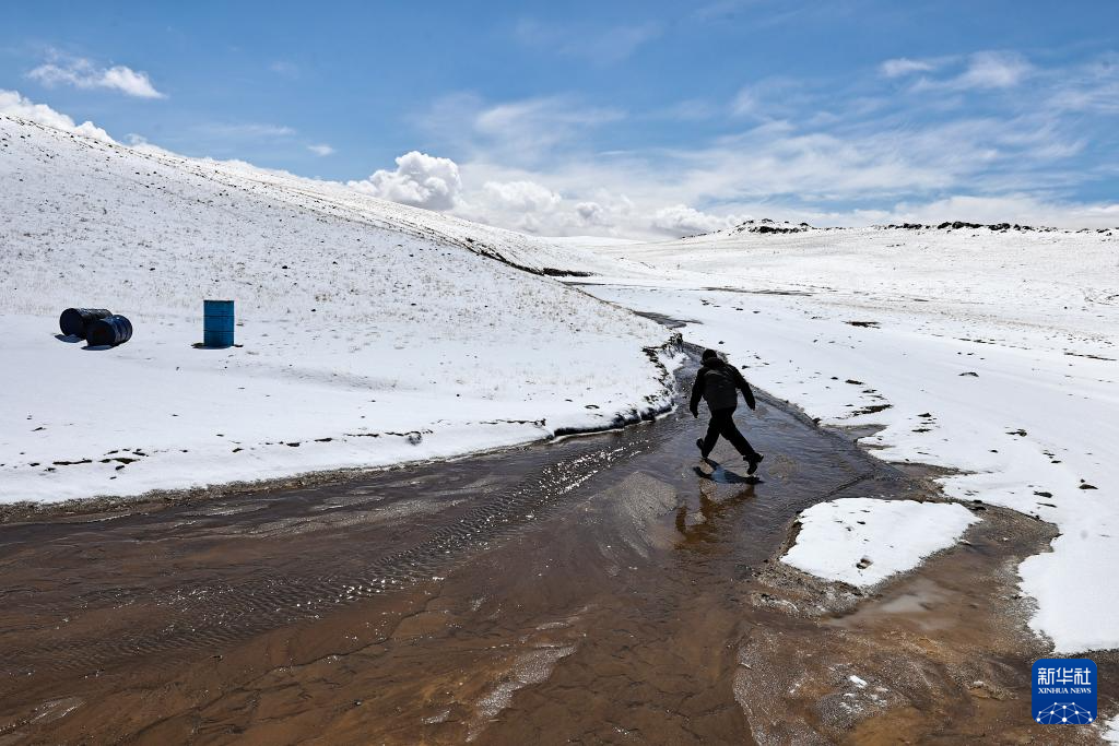4月10日,羌塘国家级自然保护区那曲地区管理局野生动物专业管护员伟东在“巴毛穷宗”地区跳过河流查看非法穿越者遗弃的油桶。