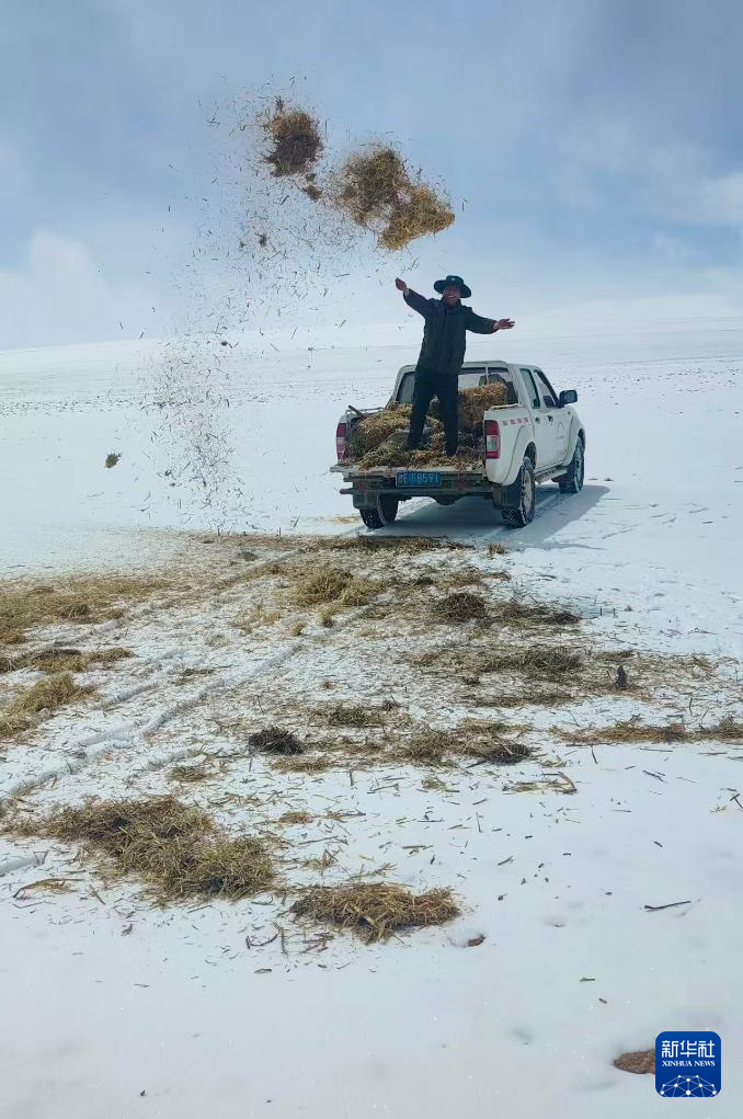 4月13日,羌塘国家级自然保护区那曲地区管理局野生动物专业管护员在藏羚羊、野牦牛的出没区域抛撒草料(手机照片)。