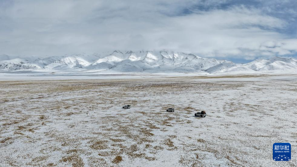 4月9日,羌塘国家级自然保护区那曲地区管理局的巡护队伍在雪中穿越崎岖地貌(无人机照片)。