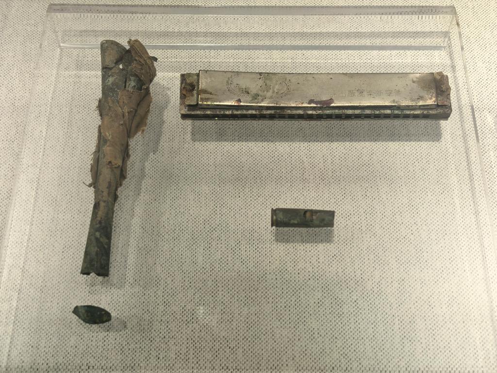 陵园纪念馆的展柜中,这把口琴旁边还静卧着一只小铜号,号管早已锈迹斑斑,管口处也出现了破洞。