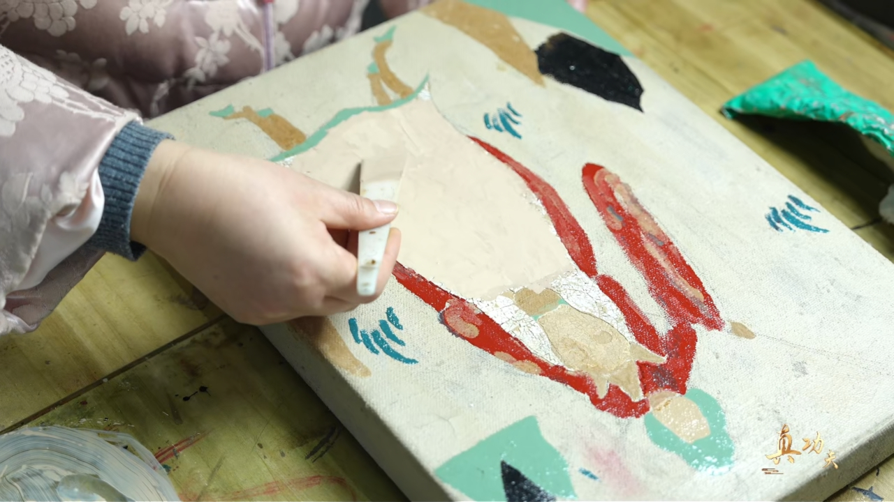 在张艳丽的工作室中,漆艺创作始终有条不紊地推进,每一个环节都彰显着细致与严谨。采访时,一幅作品正处于蛋壳粘贴后的巩固阶段,工作人员需用白漆对作品中马的形象进行固定,确保工艺精准到位,这份严谨态度,也贯穿于张艳丽的整个漆艺传承之路。
