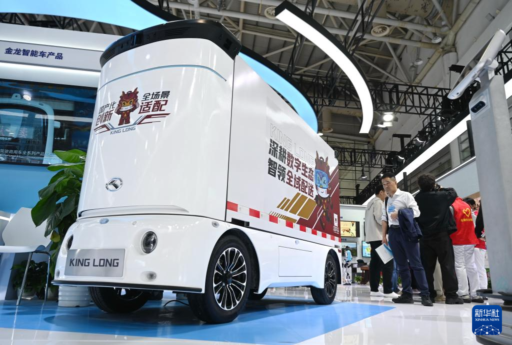 4月29日拍摄的第九届数字中国建设峰会现场体验区展出的金龙无人配送车。