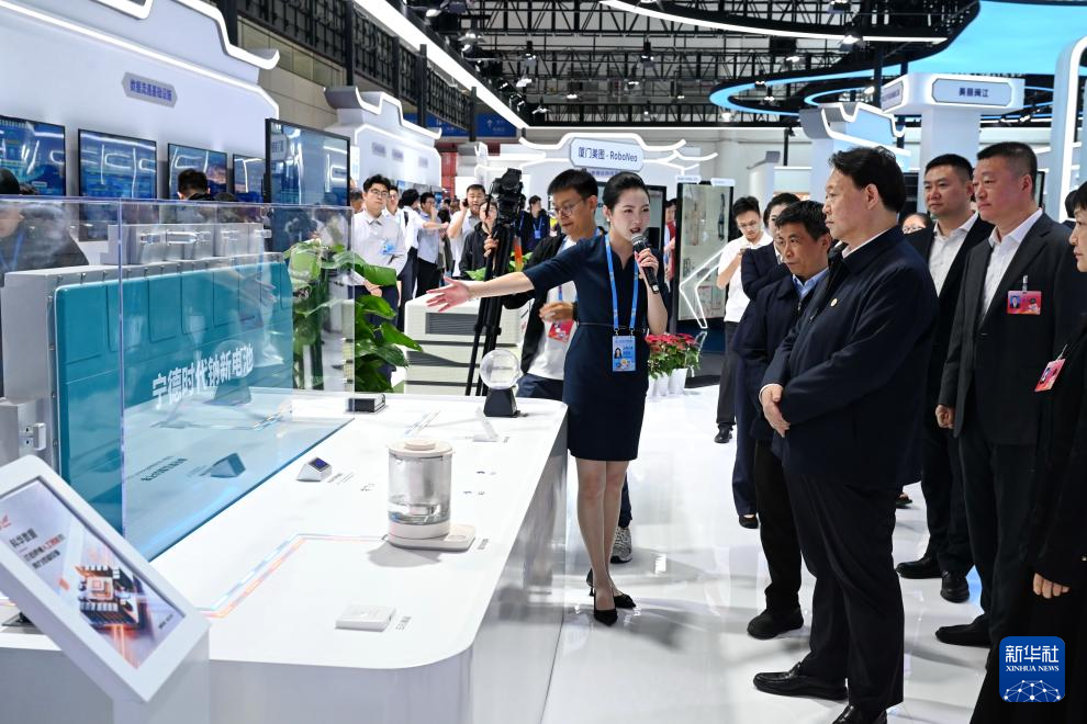4月29日,工作人员在第九届数字中国建设峰会现场体验区向参观者介绍宁德时代钠新电池。