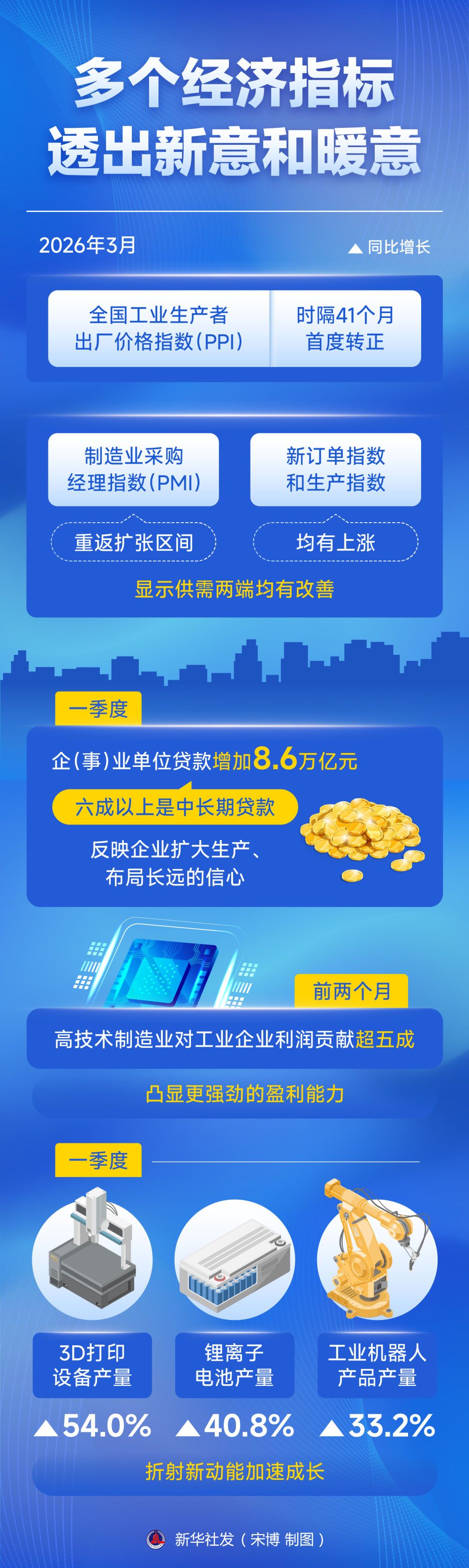 一季度,3D打印设备、锂离子电池、工业机器人产品产量同比分别增长54.0%、40.8%、33.2%,折射新动能加速成长;