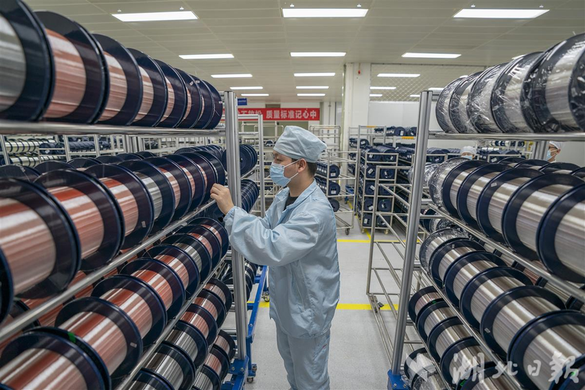 长飞光纤光缆股份有限公司车间,员工在仔细检查、测试即将出厂的多模光纤。(湖北日报全媒记者 魏铼 摄)