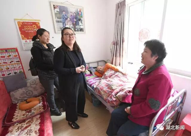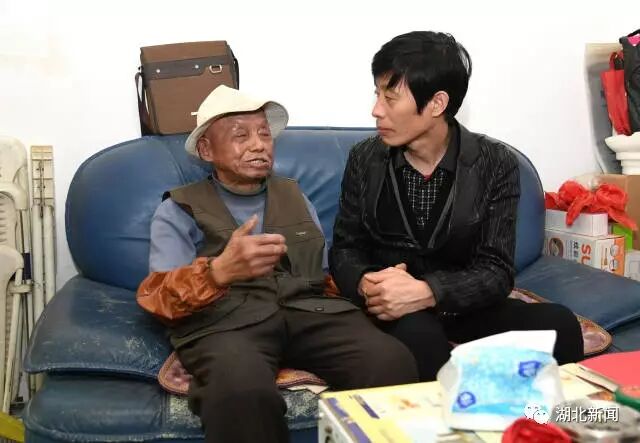 百步亭文卉苑社区副主任方伟(右)到社区独居老人庞云鹏家探望
