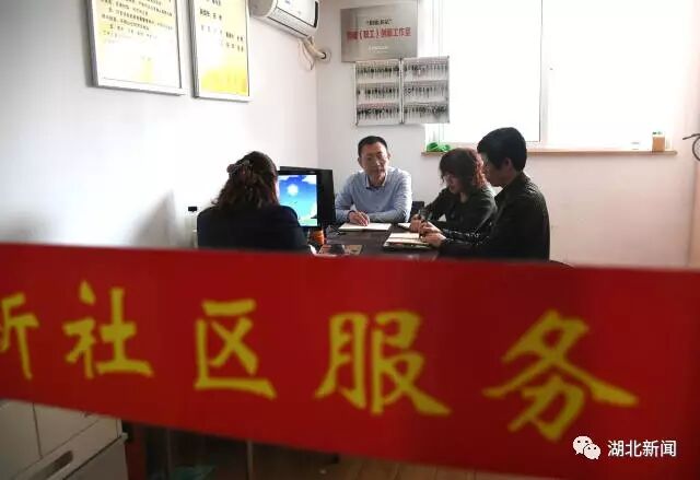 百步亭文卉苑社区“钥匙书记”办公室的工作人员在商讨居民服务事宜