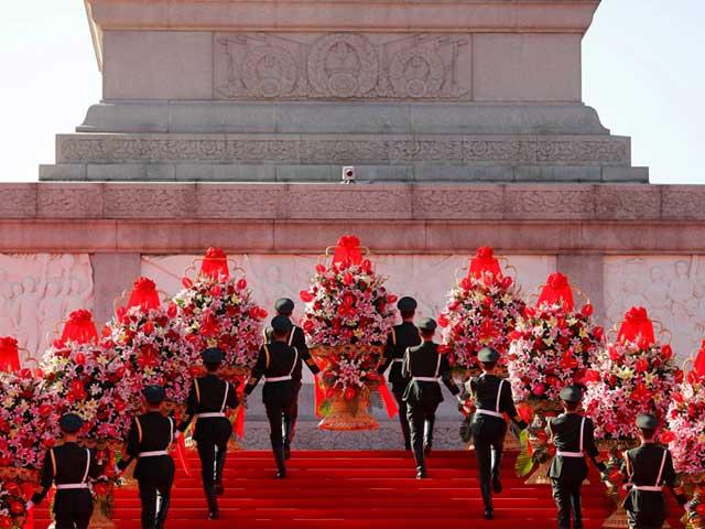 群众方阵前,以中共中央,全国人大常委会,国务院,全国政协,中央军委,各民主党派、全国工商联和无党派爱国人士,各人民团体和各界群众,老战士、老同志和烈士亲属,中国少年先锋队名义敬献的9个大型花篮一字排开,花篮红色缎带上写着“人民英雄永垂不朽”的金色大字。