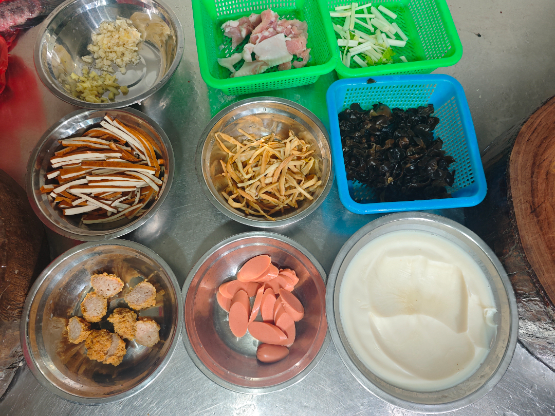 在竹根滩镇街头,丰顺餐馆已经营了16年。午后的后厨里,老板兼主厨张丰正细心打理着制作贺菜的食材——大白菜紧实饱满,黑木耳舒展透亮,肉丸子圆润弹牙,五花肉、香干、火腿肠、黄花菜、芹菜等分门别类码得整整齐齐,每一样都透着浓浓的家常味儿。