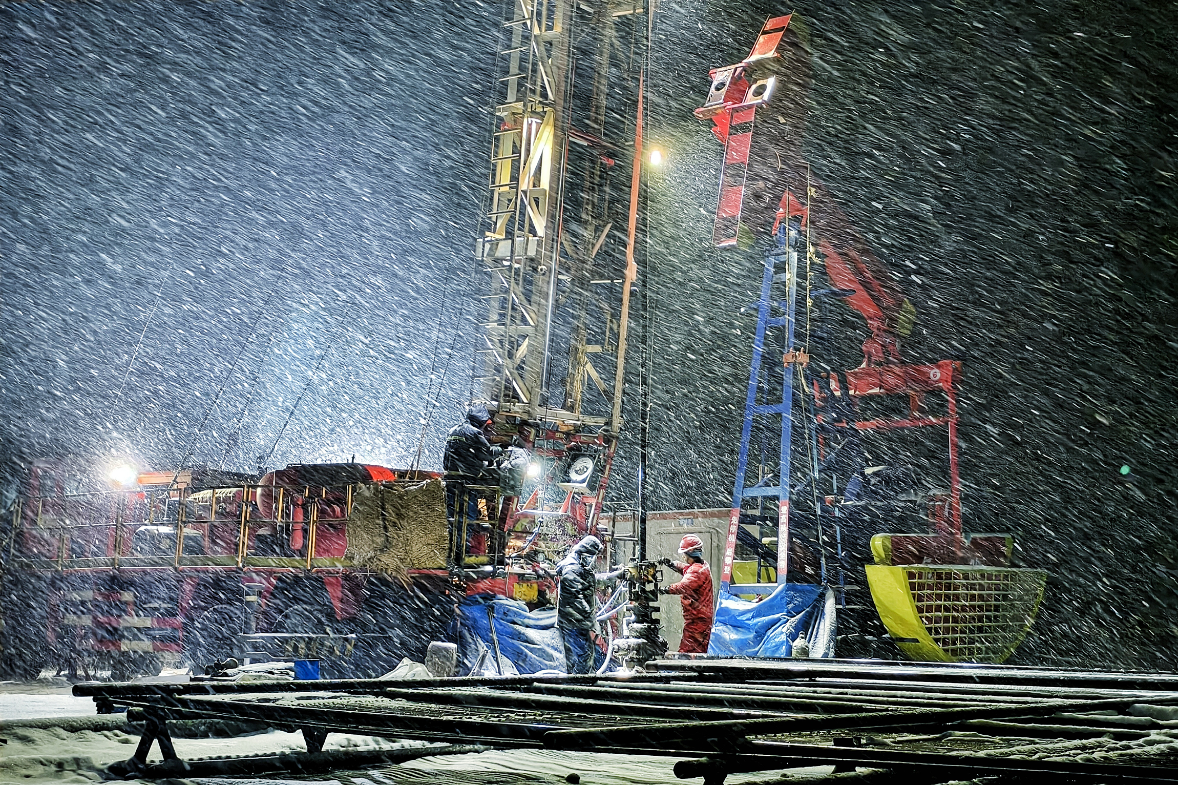 江汉油田采服中心JH-XJ121修井队风雪鏖战保油脉。潜江市融媒体中心记者 杨靖 通讯员 易云镖 摄