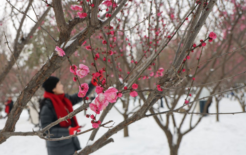 1月20日,梅苑迎来降雪,漫天雪花轻覆枝头,朵朵梅花迎雪绽放、傲然挺立。艳若霞帔的红粉梅朵与洁白雪花相互映衬,层次分明、景致如画,让冬日梅苑宛如一幅灵动雅致的诗意画卷。