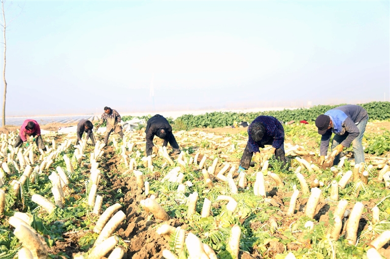 1月24日,竹根滩镇王拐村七组田间一片繁忙,工人们正抓紧采收白萝卜。该种植基地面积达500亩,自去年12月下旬启动采收以来,平均每日采收量达100吨,为当地村民带来了可观的经济收入。(潜江市融媒体中心记者 王宇杰 通讯员 钟宇萍 摄)